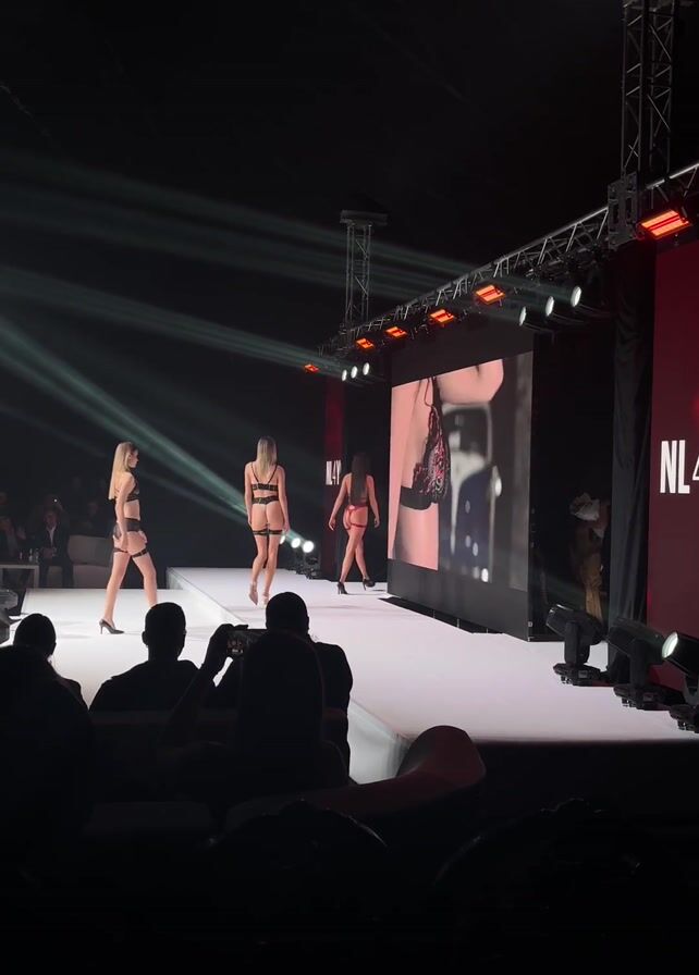 Models are walking down a white runway, wearing lingerie and heels, in front of an audience. A screen behind them shows close-up images of a model wearing similar clothing. There are lights and scaffolding above the runway, and the name "NL4Y" is visible on a red sign next to the screen. Audience members are taking photos.
