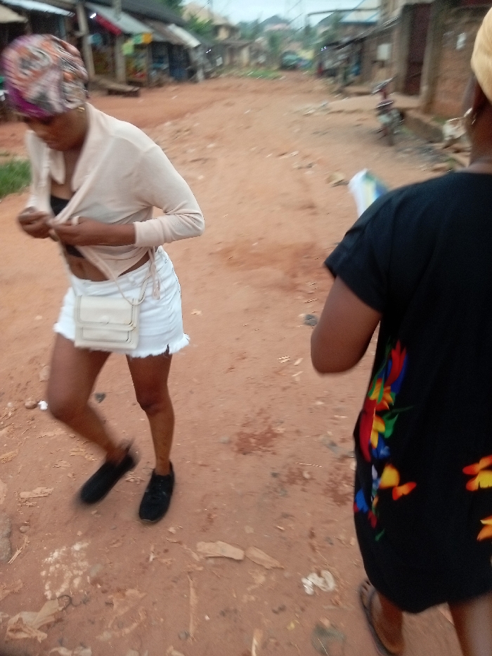 Two women stand on a dirt road. The woman on the left wears a headscarf, cream-colored cardigan, white denim mini-skirt, and black shoes, adjusting her top. She also has a small white bag. The woman on the right wears a black shirt with a multicolored floral print and brown sandals. The background shows a typical village scene with simple buildings lining the road, and a parked motorcycle.