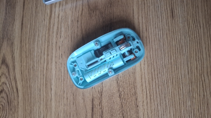 The internal components of a turquoise-colored, disassembled computer mouse are visible. The base shell of the mouse, along with the electronic circuits, battery compartment containing a cylindrical battery, and screws are viewable. The mouse rests on a wooden surface exhibiting wood grain texture. The orientation reveals the inner workings usually covered by the exterior shell.