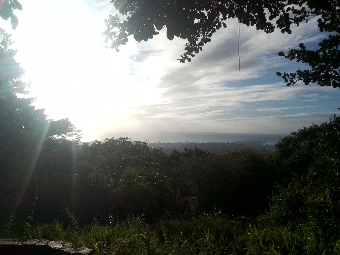 The image displays an elevated panoramic view of a coastal landscape, likely facing west or east, with a low sun positioned in the upper left quadrant, indicating either sunrise or sunset. The scene overlooks the urban and natural environment of Las Piedras, Falcón state, Venezuela, extending towards a large body of water consistent with the Caribbean Sea. The immediate foreground consists of dense, dark green ground vegetation, including grass and various shrubs, partially obscuring a low, dark stone or concrete barrier at the bottom edge of the frame. The midground is dominated by a continuous canopy of dark green treetops and foliage, rendered in silhouette due to the intense backlighting. In the background, a hazy expanse of land is visible, containing indistinct urban structures and extending to meet a broad body of water, approximately 2-3 kilometers distant. The horizon line where the water meets the sky is discernible. The sky, occupying the upper half of the frame, is characterized by an intense, overexposed white light source in the upper left, producing significant lens flare and light rays. Away from the direct sunlight, the sky exhibits layered white and grey stratus clouds against a pale blue background. Dark, silhouetted tree branches and foliage frame the top edge of the image. A thin, dark, vertical linear object, approximately 10-15 centimeters in visible length, hangs suspended from an overhead branch in the upper right quadrant of the scene. No discernible people or animals are present.