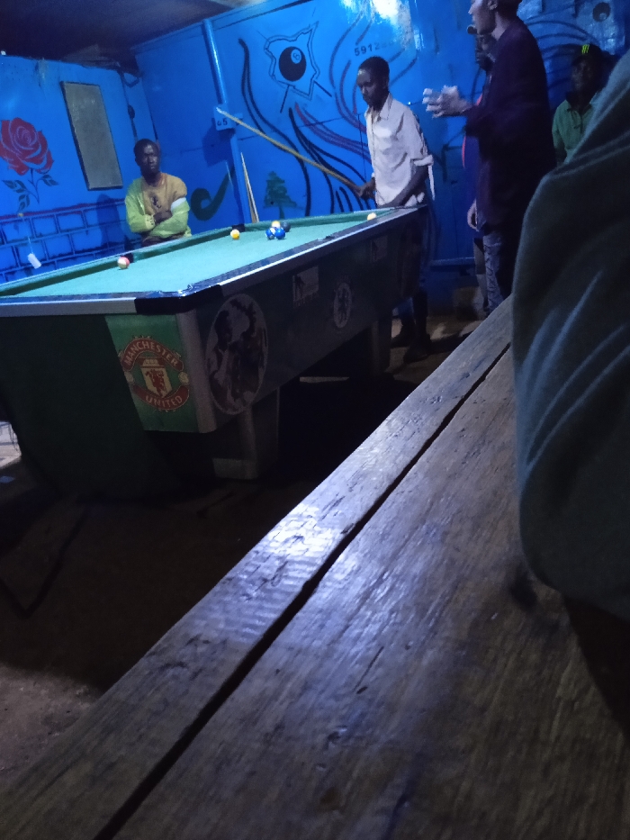 A dimly lit room showcases a pool table with the Manchester United logo and several pool balls. Two men stand near the table, one appearing to aim with a pool cue. The blue wall behind features painted designs, including a rose, a pool ball, and abstract patterns. A wooden table occupies the foreground, with a person seated partially in the frame. Overall, the scene depicts a casual pool game setting with distinct branding and artwork.