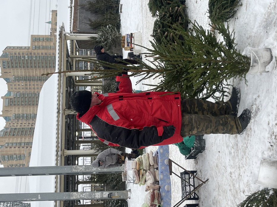 The scene depicts an outdoor winter market on an overcast, snowy day in the area of Udelny Market, near Udelnaya Metro Station, Saint Petersburg, Russia. Snow covers the ground, market stalls, and rooftops. In the foreground, a male individual, appearing to be in his 40s or 50s, stands facing towards the right, engaged with a small evergreen tree. He wears a red and black winter jacket with reflective grey strips on the shoulders, camouflage patterned trousers, black winter boots, and a black knit hat. His left hand is near the upper trunk of the tree, which stands upright in a white plastic bucket partially filled with snow, while his right hand is positioned lower on the tree. Piles of similar evergreen branches or small trees lie horizontally on the snow to his right. To the left of the primary individual, a second male in a grey hooded winter jacket is visible, leaning over a table covered with a light blue and white patterned tablecloth. On the table, several plastic-wrapped packages, likely containing lard or meat products, are stacked. Below this table, a black plastic crate and a folded metal stand are present. Further back and to the right, a third, partially visible individual in dark clothing is bent over near a small display of stacked cardboard boxes on the snow. The background features a long, low-rise covered structure with a snow-laden roof, supported by multiple columns, typical of a market pavilion or railway platform. Beyond this, several large, multi-story residential buildings with beige facades are visible against the pale sky, consistent with the architecture found near Udelnaya Metro Station. Two tall, grey utility poles stand vertically in the midground on the left. The overall scene suggests commercial activity in a cold, urban environment.