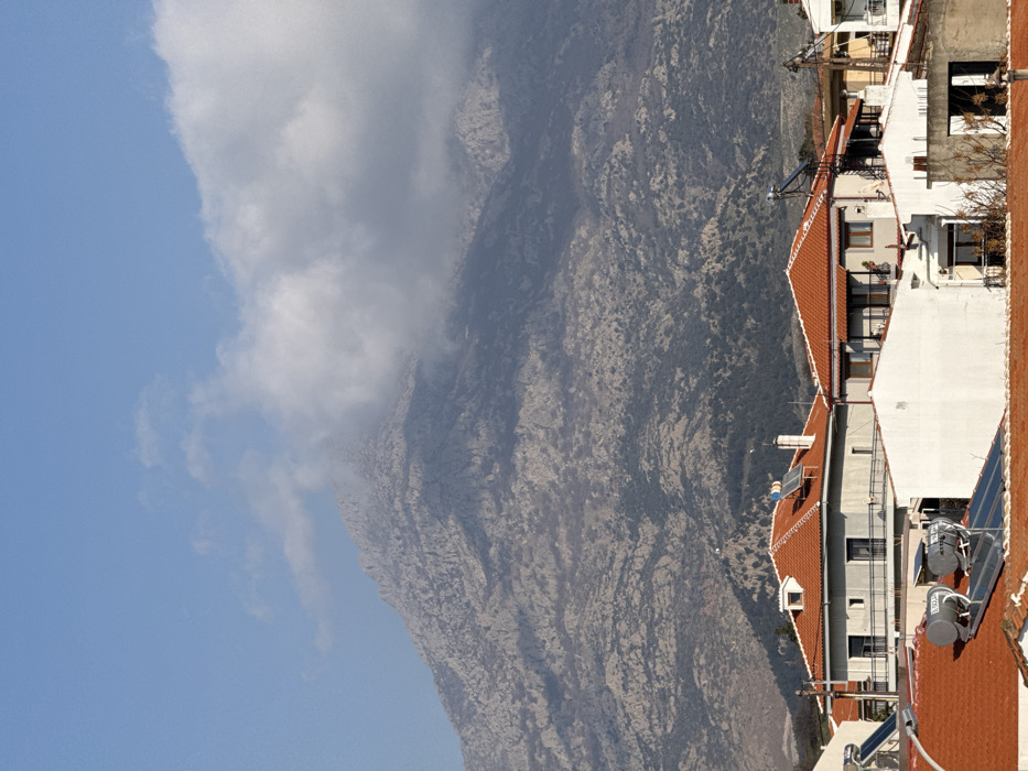 This image presents a panoramic view of the city of Kamariotissa, Greece, with a prominent mountain in the background