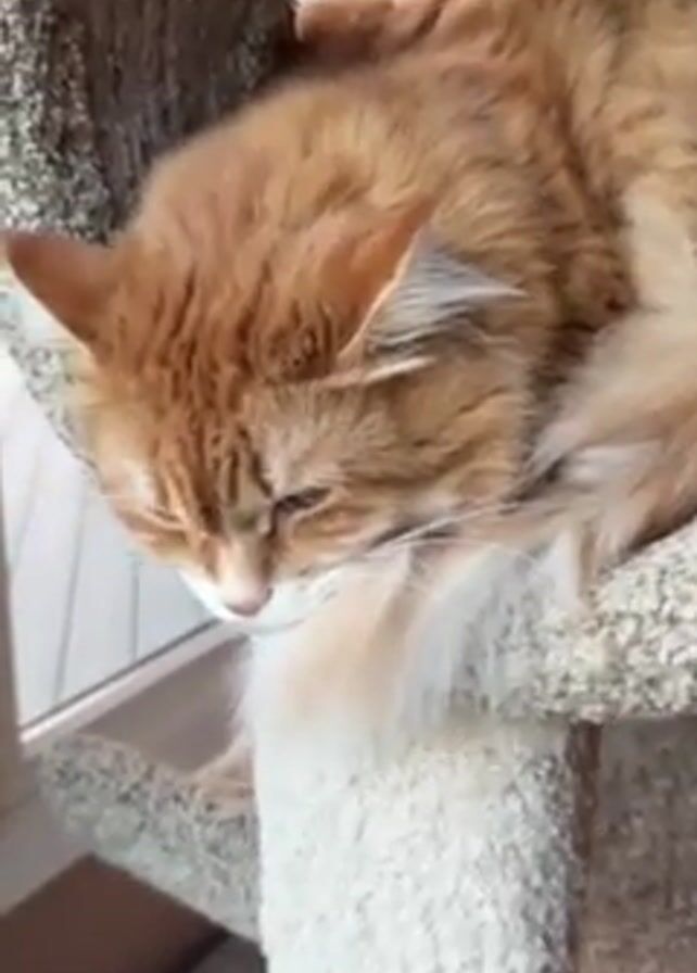 fluffy orange tabby cat with white markings dozing on a beige cat tree. The cat slowly opens its eyes and then closes them again, while a person's voice says, "He's sleeping." The person's voice then says, "He loves kisses, and we can cuddle him." The environment appears to be indoors, near a window.