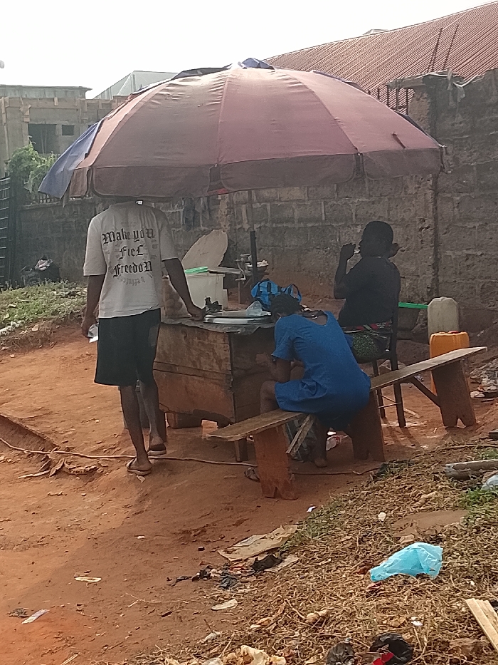 A street food vendor with an umbrella shields a small wooden stall. Two women sit on a bench at the stall, while a man wearing a "Make You Feel Freedom" t-shirt stands nearby. The ground is red dirt and there is litter scattered around. Buildings and a brick wall are visible in the background.