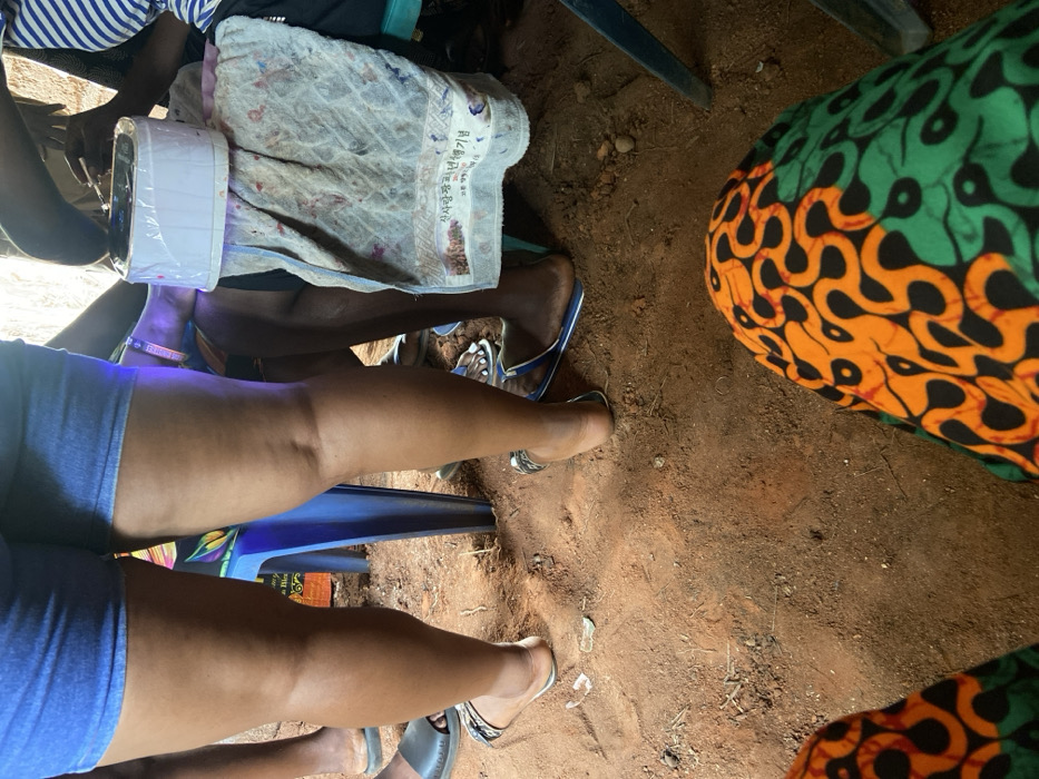 The scene depicts a gathering of individuals, viewed from a low perspective, likely outdoors or in a semi-open structure with a reddish-brown earthen floor, located in Ojoto, Nigeria. In the foreground, the observer's lower thighs are visible, clad in trousers featuring a distinct orange, green, and black geometric pattern. Several individuals occupy the midground. To the left, a person, likely standing or seated on a blue plastic chair, wears blue denim shorts and dark sandals with a silver buckle, exposing their bare legs. Adjacent to them, another person is seated, their right arm visible with a multi-colored wristband, and their lower legs in dark footwear. Directly in front of this seated individual, a white rectangular electronic device, possibly a UV nail lamp or a portable speaker, encased in clear plastic, rests on a light-colored towel. The towel, stained with various colors, displays Korean text ("사랑나무추모기념"). The towel is draped over the lap of the seated person, whose feet, wearing blue flip-flops, are visible on the earthen ground. A third person is partially visible to the far right, wearing striped clothing. The ground is consistently reddish-brown earth, uneven, with small stones and debris scattered throughout. The lighting suggests an outdoor environment with direct sunlight.