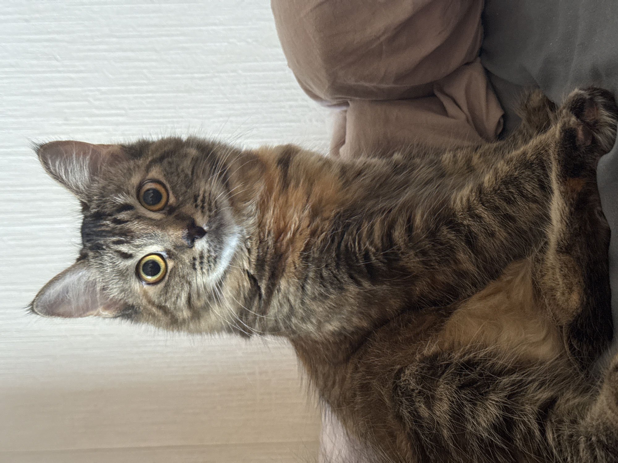 A domestic cat, exhibiting a long-haired tabby coat primarily composed of brown, black, and ginger hues, is depicted seated upright and facing forward. Its large, round eyes feature prominent amber irises and dilated black pupils. The cat's ears are erect and pointed, with faint tufts of fur visible. Its front paws are positioned together, resting on a dark grey fabric surface, likely bedding. To the right of the cat, a crumpled light brown or pinkish fabric object, possibly a pillow or blanket, is visible. The background consists of a light-colored, vertically textured surface, indicative of an indoor wall or curtain. The scene is located in the city of Murino, Russia. No other individuals or active interactions are present.
