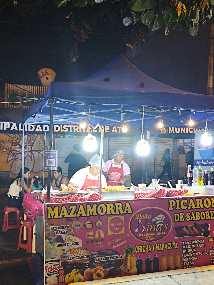 A vibrant Peruvian food stall at night, illuminated by hanging lights under a blue canopy