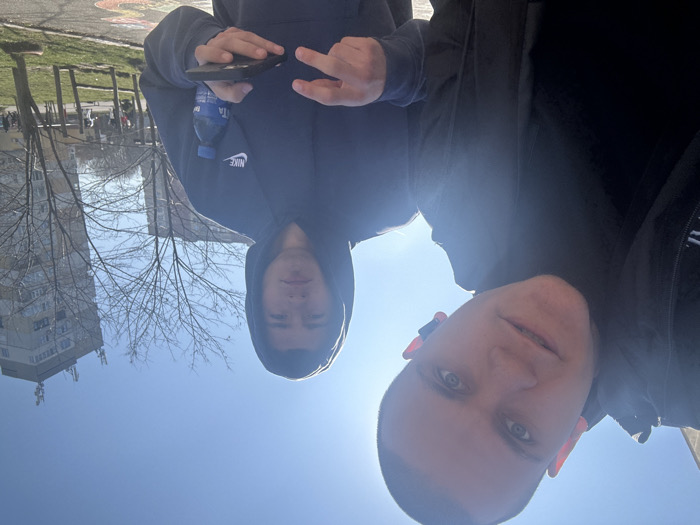 An outdoor image captured on a bright, sunny day depicts two males in a residential area of Sofia, Bulgaria. The foreground subject, a male with short, buzzed hair and blue eyes, wearing a black jacket and a black earbud in his right ear, is positioned for a close-up, appearing to take a selfie. To his right, a second male, wearing a navy blue Nike hooded sweatshirt with the hood up, holds a dark-colored smartphone in his left hand and a blue plastic "AQUA VITA" water bottle in his right. The background consists of a grassy park-like area with scattered bare deciduous trees. A paved path with colorful ground markings is visible to the lower right. Beyond the trees, multi-story, concrete apartment buildings characteristic of post-WWII Eastern European architecture are visible. One prominent building on the right features multiple telecommunication antennas on its roof. Small figures are discernible in the far background, suggesting a public recreational space. The scene is consistent with a residential district in Sofia.
