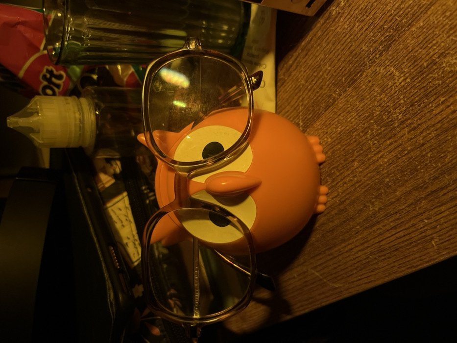 n owl-shaped object with glasses resting on it. The owl is orange and faces the camera with large, white eyes. Behind the owl, there is a wood-like surface. Other items in the image include a bottle with a dropper, a glass jar, and a red and pink package. The overall lighting is dim, giving the image a warm tone.