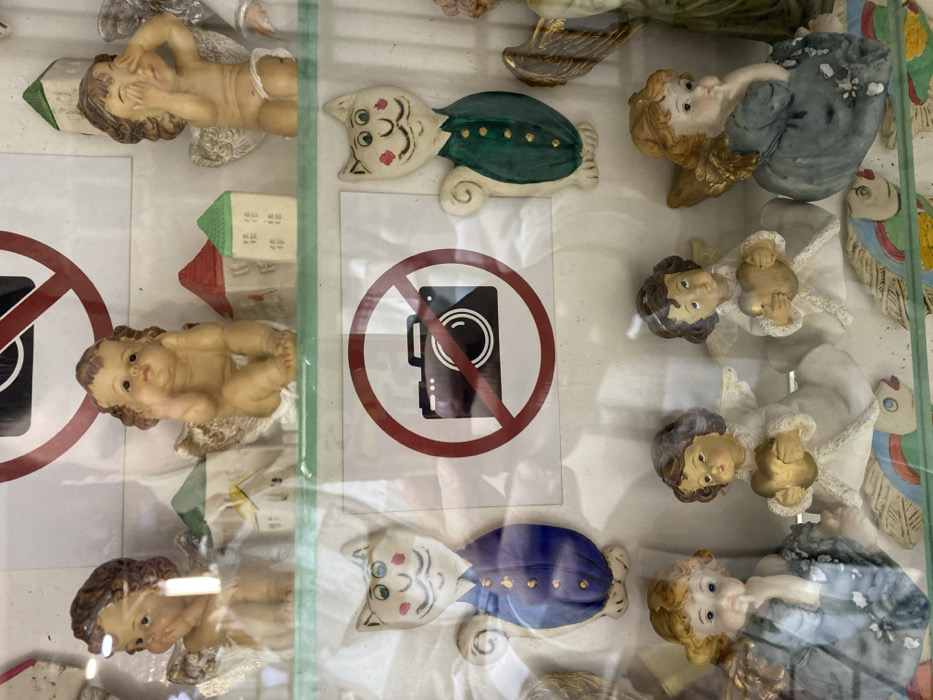 The image displays a multi-tiered glass display case containing various figurines, located in Budva, Montenegro. The objects are viewed through a reflective transparent surface. The top shelf features three cherub-like figurines with brown hair and white wings. The leftmost figure has its right hand near its mouth. The central figure has both hands near its ears. The rightmost figure has both hands covering its eyes. Between these figures are miniature house figurines with variously colored roofs (green, red, white). A partially visible "no camera" symbol is present at the top. The middle shelf showcases two cat figurines and a prominent circular "no camera" sign. The left cat figurine is white with a mustache, pink cheeks, green eyes, and a curled tail, dressed in a blue button-up jacket. The right cat figurine is identically styled but wears a green button-up jacket. The "no camera" sign, featuring a black camera icon with a flash crossed by a red diagonal line, is centrally placed on a white background between the cat figurines. The bottom shelf holds four cherub-like figurines, each seated on a stylized, elongated fish figurine painted with segments of blue, yellow, green, and red. From left to right: a figurine with blonde hair and gold wings wears a light blue floral dress, with its right hand near its chin; two central figurines, both with brown hair and white wings, wear white dresses and each hold a gold-colored heart; the rightmost figurine has red-blonde hair and gold wings, wears a dark blue-grey dress, and has its right hand near its chin. The background of the display case is uniformly white. Light reflections are visible on the glass display surface.