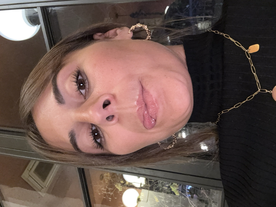 A fair-skinned woman gazes upwards, revealing brown eyes enhanced with mascara. Her full lips, coated with clear gloss, are slightly parted. She wears a black turtleneck sweater and a gold chain necklace with two charms. Her hair is light brown, and she adorns delicate gold hoop earrings. The background shows an interior space reflected in glass, featuring a window and a round light fixture.