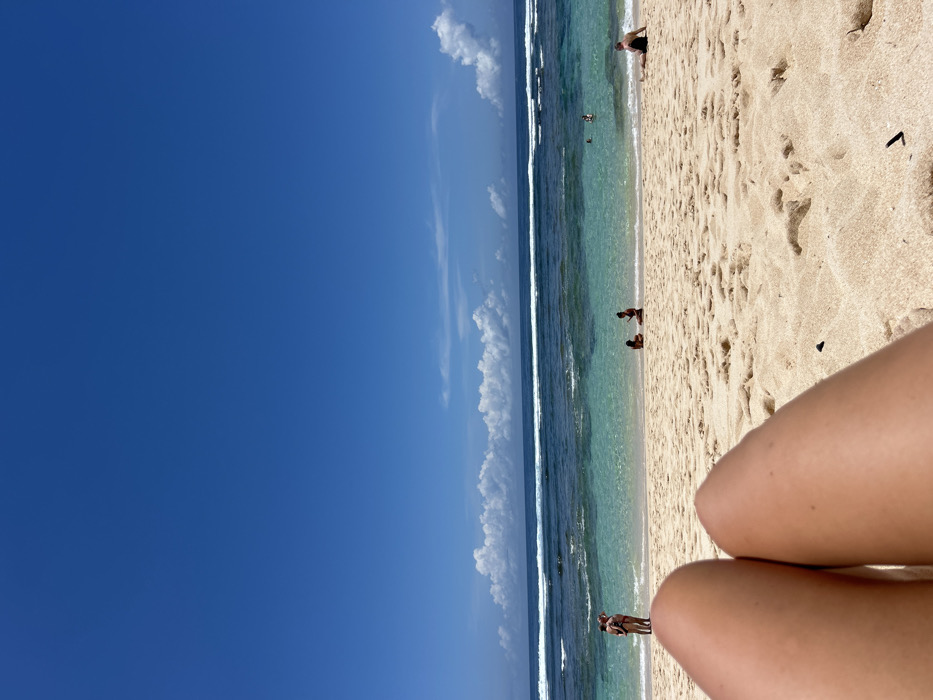 The image depicts a first-person perspective from a sandy beach in Ungasan, Indonesia, looking towards the ocean under a clear blue sky. In the immediate foreground, the photographer's bare legs, tanned, extend from the bottom center of the frame. The beach consists of light beige sand. Multiple individuals are present on the beach and in the water. On the left side of the beach, near the waterline, two adults in swimwear stand and appear to be conversing. Towards the center-right of the beach, two adults in swimwear are seated on the sand, facing the ocean. Further right, a lone adult male in dark swim trunks reclines on the sand, facing away from the water. The ocean exhibits clear turquoise water near the shore, transitioning to deeper blue further out. Multiple lines of white breaking waves are visible. Several individuals are present in the water, swimming or wading. The sky, occupying the upper two-thirds of the frame, is a vibrant, cloudless blue, with a band of white cumulus clouds horizontally positioned above the ocean horizon.