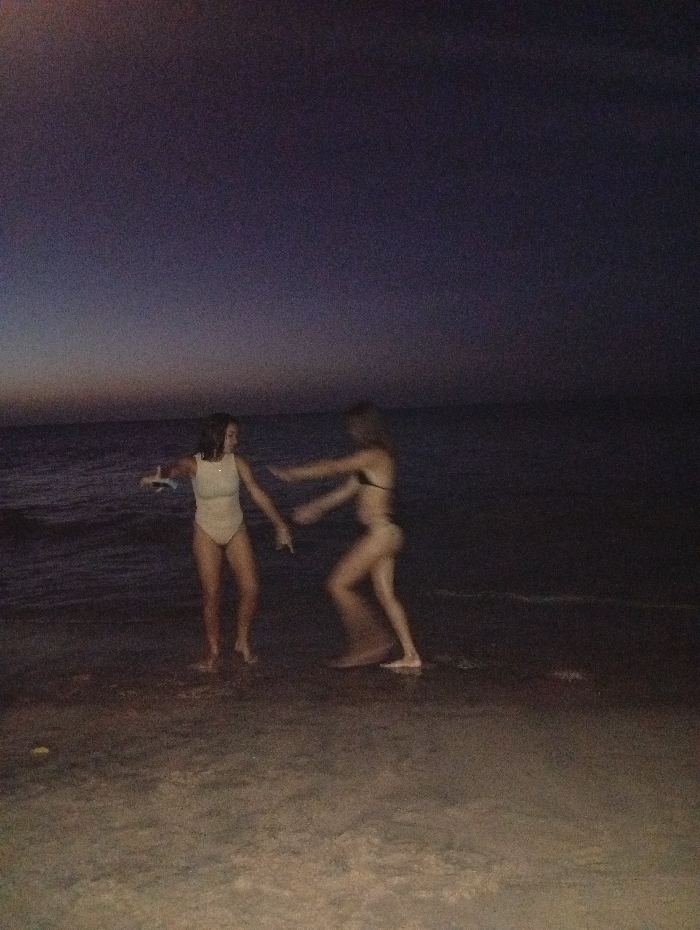 Two women, likely on a beach, stand near the water's edge at dusk or night. The woman on the left wears a light-colored one-piece bathing suit, while the other wears a dark-colored bikini. They appear to be interacting playfully, possibly dancing or moving toward each other. The background consists of a dark sky and indistinct ocean. The scene is dimly lit, creating a sense of obscurity.
