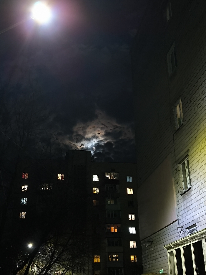 The image depicts an urban residential scene at night in Vinnytsia, Ukraine. A bright, artificial streetlamp is visible in the upper left, emitting a strong white light with a lens flare. The night sky is dark, filled with dense, textured clouds that partially obscure a luminous moon, creating bright highlights. To the right, a multi-story residential building with a light-colored brick facade occupies the right side of the frame. Several windows are visible, and a prominent yellow-orange light source illuminates a section of its lower exterior. Below this, an enclosed ground-floor extension or balcony is present. Further back and to the left, another multi-story residential building, darker in appearance, is partially visible. Numerous windows on this building are illuminated with a mix of warm amber and cool white light, indicating interior activity. Some windows reveal interior blinds or curtains, and several balconies are apparent. In the lower left foreground, the bare branches of deciduous trees are silhouetted against the dark environment. A faint, low-level light source is partially visible near the bottom left among these branches. No individuals are discernible in the captured scene.