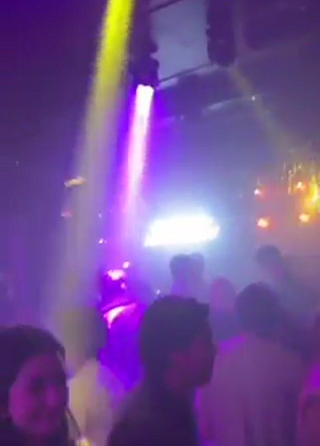 The video depicts a crowded nightclub environment, with numerous people visible in silhouette under intense lighting
