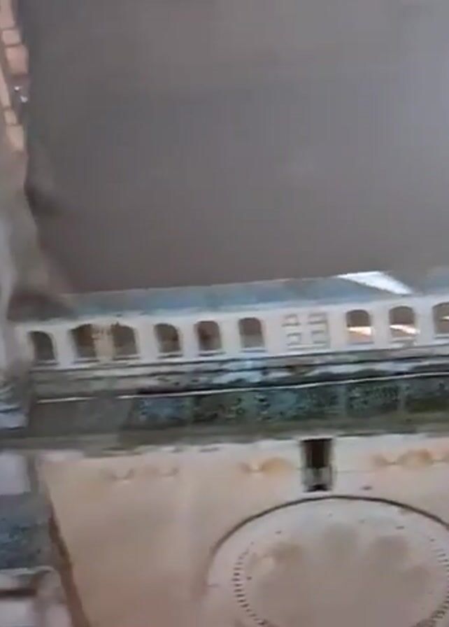The video presents an upward-angled view of an architectural model featuring structures with arches, columns, and multiple levels