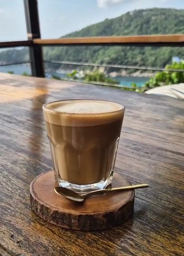 A short video opens with a close-up of a glass of coffee with a tan surface on a small wooden coaster and a small golden spoon on a weathered wooden table. The video then pulls back and up to show a scenic view behind the table. The scene is an outdoor deck overlooking a bay with green hills and a blue ocean under a cloudy sky. The camera moves to capture more of the view, including small islands in the distance. A lamp hangs from the beams supporting the deck's roof. There are no people visible in the video.