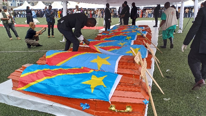 This image depicts an outdoor ceremonial event on an artificial turf field, consistent with a stadium or sports complex, located within the city of Goma, Democratic Republic of the Congo. In the foreground, a row of eight reddish-brown wooden coffins rests on a long white-draped platform. Each coffin is partially draped with the national flag of the Democratic Republic of the Congo, identifiable by its light blue field, yellow star, and diagonal red stripe bordered by yellow. A man in a dark suit with a white shirt is observed in the foreground, bending over a coffin to meticulously adjust the draped national flag. To the left, a woman in a dark shirt and olive-green pants crouches on the turf, holding a camera or recording device pointed towards the coffins. Other individuals are present in the midground and background: a man in a vest and jeans stands observing to the left; a person in green scrubs and a light-colored vest walks in the midground to the right; and the lower body of a person in a dark suit with white gloves is visible walking away on the far right. Numerous attendees are gathered in the background, standing on the artificial turf under and around several large white event tents. Residential buildings are visible in the distant background, situated on a slight incline, confirming an urban environment.
