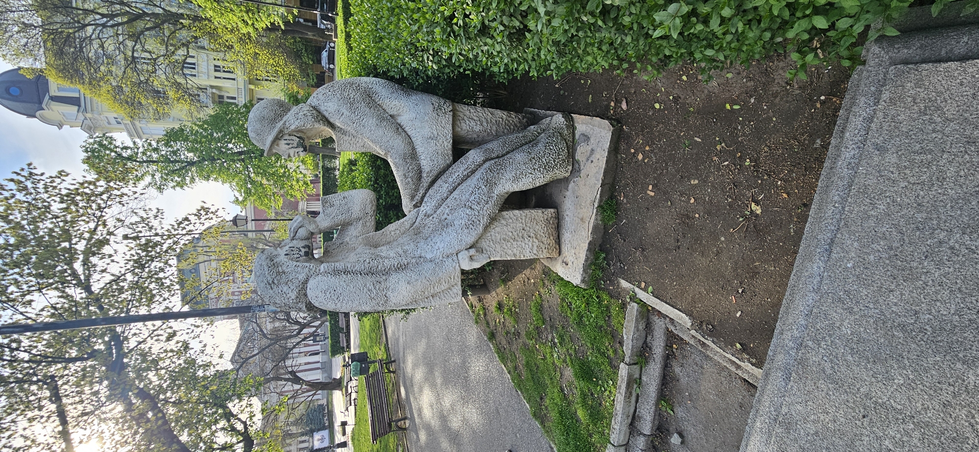 concrete sculpture of two soldiers in a park in Sofia, Bulgaria. One soldier is standing and leaning over the other, who is lying down. The sculpture is located near a walkway in a park with trees, benches, and lamp posts visible in the background. Buildings are also visible in the distance. The foreground includes a gray concrete border.