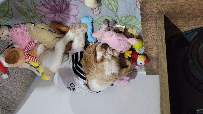 - "A tan and white Cavalier King Charles Spaniel puppy sleeps on a floral-patterned rug, surrounded by plush toys" by FM-yo11E2, licensed under CC BY 4.0