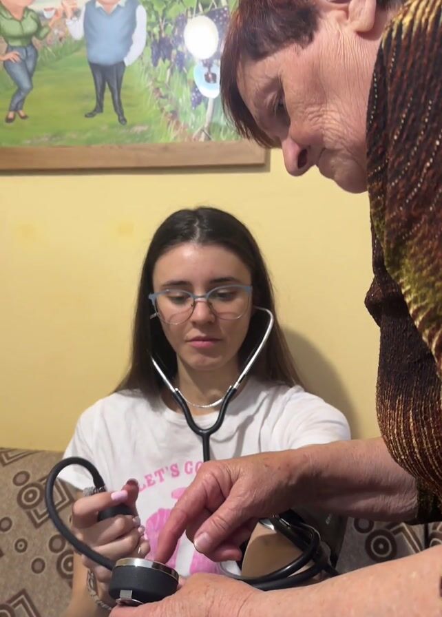 A woman sits on a couch while another woman helps her take her blood pressure. The sitting woman wears a white t-shirt with pink letters, glasses, and a stethoscope around her neck. She holds a black blood pressure monitor in her left hand. The second woman, with short red hair and a brown and green patterned shirt, is putting the blood pressure cuff on the sitting woman's left arm. A framed painting of a man and two women toasting with wine hangs on the wall behind the couch.
