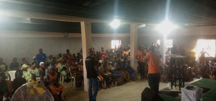 An indoor gathering, estimated at 100-150 individuals, is depicted within a structure in Kafanchan A, Nigeria