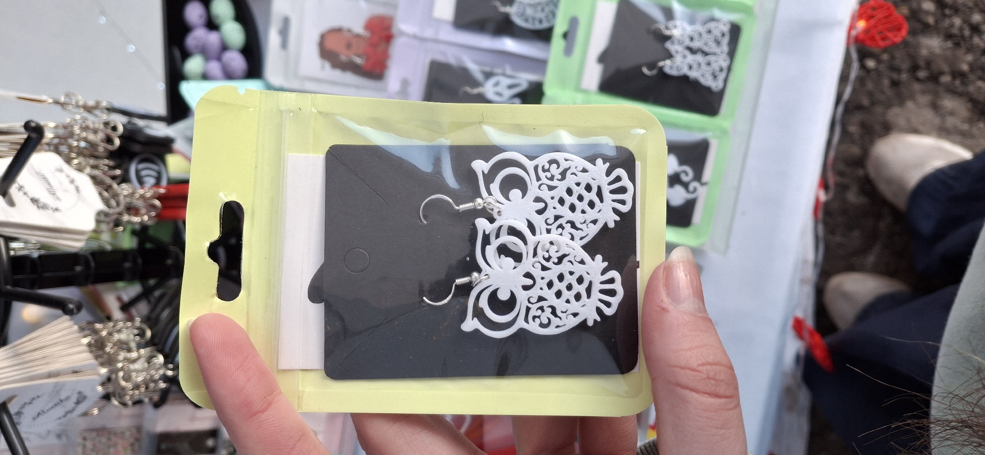 hand holding a packaged pair of owl-shaped earrings against a blurred background. The earrings are white and filigree, mounted on a black card within a pale yellow plastic package. Other earring packages are visible in the background, with similar designs. Further in the blurred background is an object that appears to be holding several earrings. A glimpse of footwear and part of a leg can be seen on the right side of the frame. The image does not contain enough information to confirm the location in the city of Slivnitsa, Bulgaria.
