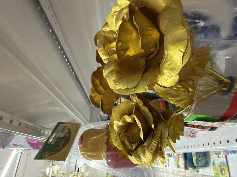 Several golden roses are grouped together, with multiple blooms visible. The flowers are on a shelf in a retail setting, surrounded by various items wrapped in plastic. The roses appear metallic or coated with gold paint. The shelf is cluttered with other objects and products for sale.