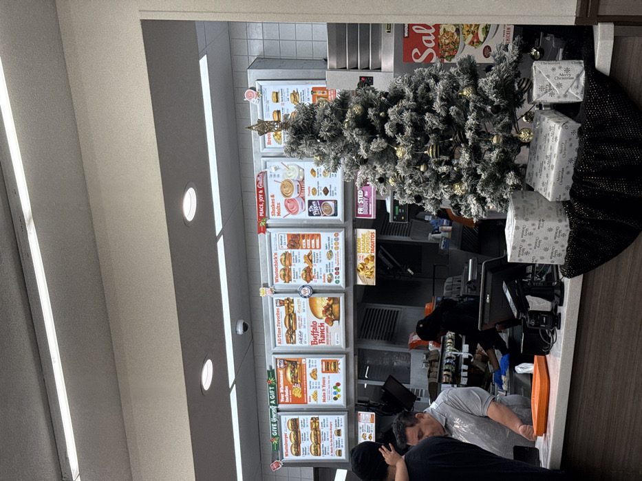 A fast-food restaurant's menu board is displayed in vertical format. It features pictures of various burgers, chicken sandwiches, shakes, and sides. A small, decorated Christmas tree sits on the counter in front of the menu, along with gift-wrapped boxes. Two people are standing at the counter.