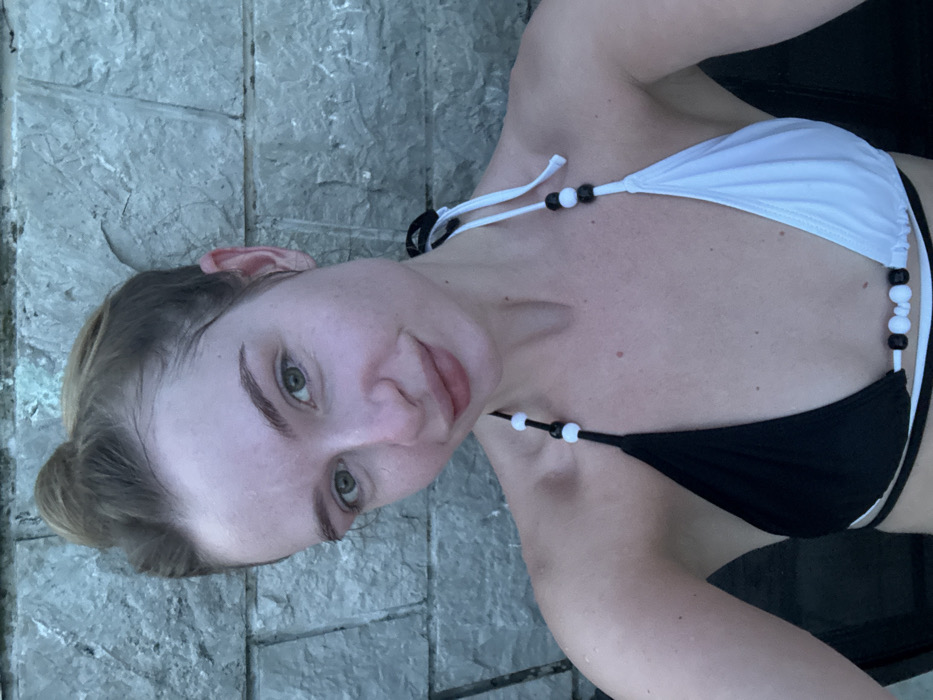A young woman lies near a gray stone surface wearing a black and white bikini top. The top has a black and white bead design on its straps. She has light skin, green eyes, and her blond hair is pulled back. Her body is slightly turned towards the camera as she looks into the lens. Part of what looks like a dark-colored pool chair is visible in the background.
