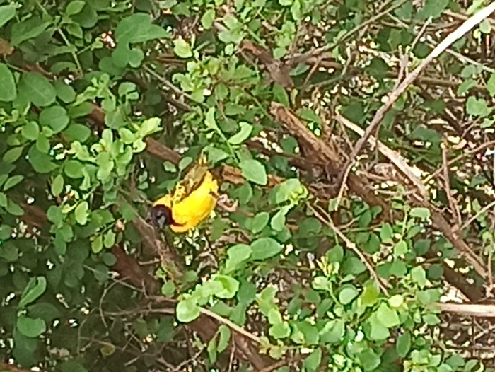 A bright yellow bird with a black head perches on a small branch amidst dense green foliage. The bird's plumage stands out against the green leaves. The surrounding greenery appears to be a shrub or small tree, with numerous small, rounded leaves. Thinner, brown branches are visible both behind and in front of the foliage. The overall image is slightly blurry and shot in daylight.