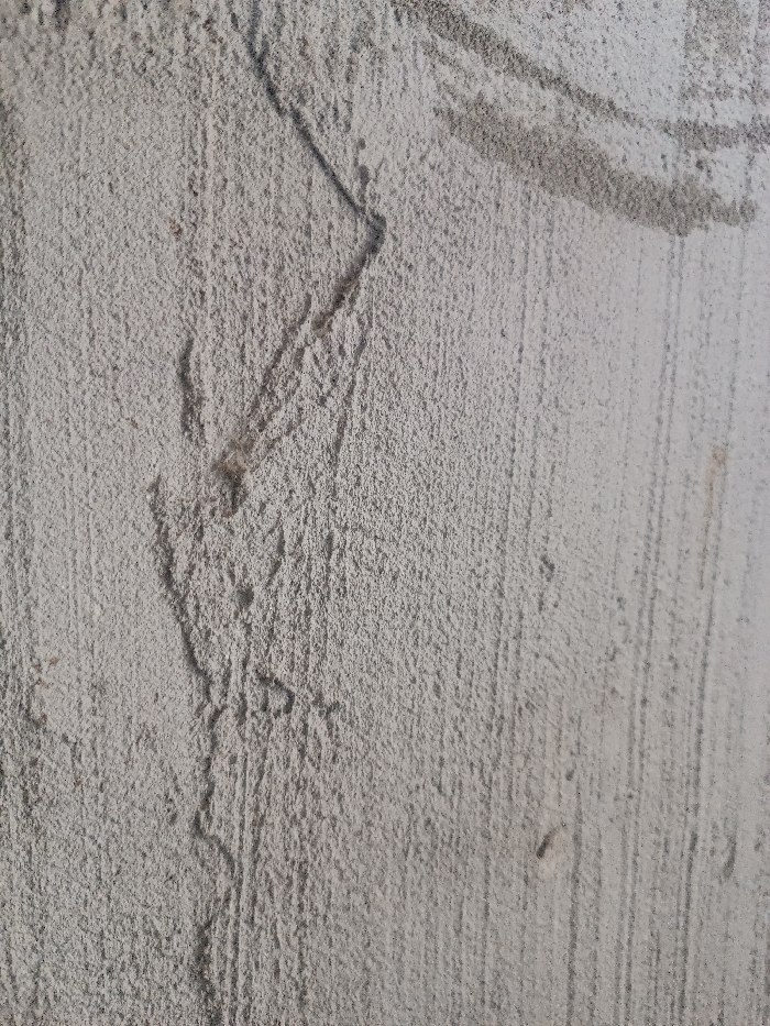 The image displays a close-up view of a light gray, textured wall surface located in Elatan, Uzbekistan. The surface exhibits a rough, granular finish, consistent with a plastered or rendered wall. Prominent features include several dark, thin, linear marks: an angular, V-shaped mark in the upper left quadrant, and a wider, curved mark in the upper right. Vertical striations, possibly from a trowel or finishing tool, are visible across the entire surface, particularly on the right side. No individuals, discernible objects other than the wall itself, or specific actions are depicted within the frame.
