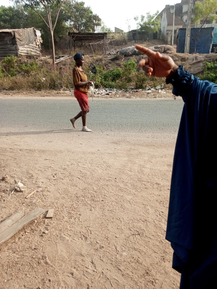 A woman in a brown shirt and red shorts walks along the side of a paved road, carrying a white object. Debris is visible on the roadside. A partially visible person points towards the woman. Behind the woman are huts, vegetation, and a building in the distance. The foreground is a sandy area with scattered pieces of wood.