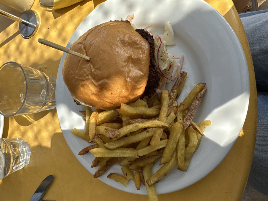 The image displays a high-angle view of a meal set on a table in Montreuil, France. A white circular plate, centrally positioned, holds a burger and a pile of french fries. The burger features a light brown, toasted bun, a dark brown patty, and a visible slaw composed of shredded white and reddish-purple vegetables. A wooden skewer is inserted vertically through the center of the burger. To the left of the burger, a substantial portion of golden-brown french fries, some exhibiting visible potato skin, is arranged on the plate. The table surface is a solid, bright yellow color. Strong, distinct shadows are cast across the table from the plate, two clear glass tumblers (one appearing empty, the other partially visible), and a small silver cylindrical object in the upper right. A silver knife handle is partially visible on the far left of the table. The lower portion of the frame shows the upper thighs and knees of a person wearing blue denim jeans, indicating a first-person perspective of a diner seated at the table in direct sunlight.