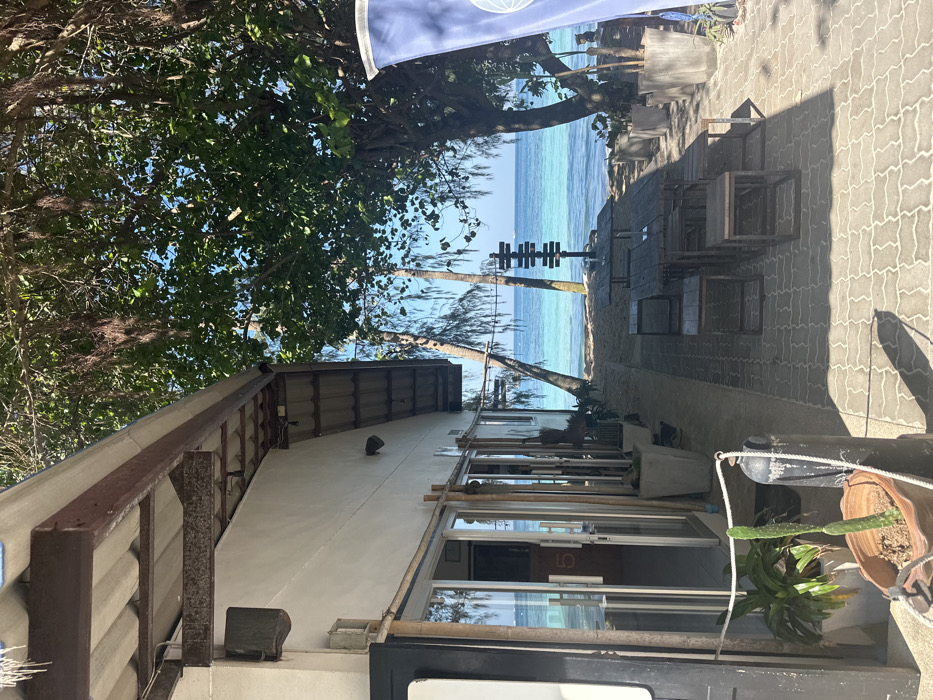 A building with a corrugated roof is partially visible. Several sliding glass doors front the building. Outdoor seating, including tables and chairs, is arranged on a paved area. A palm tree leans towards the ocean, which is calm and blue. Trees frame the scene, and a banner hangs partially at the top. A potted plant is situated near the building.