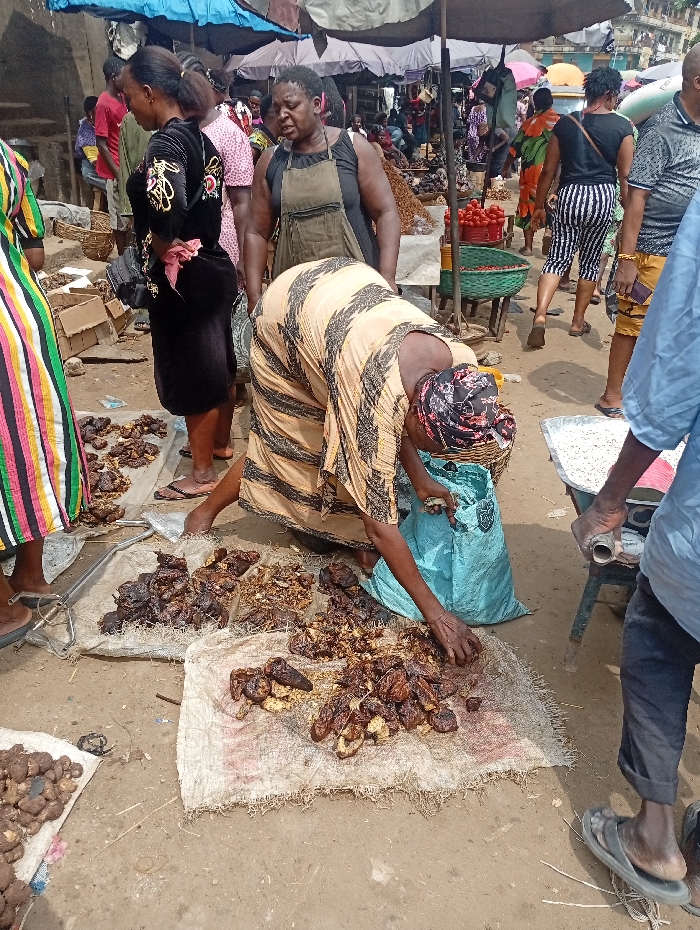 The image depicts a bustling outdoor market in Onitsha, Nigeria. The unpaved ground, primarily dirt, is visible throughout the scene. In the foreground, a woman with dark skin, wearing a light-brown patterned dress with black stripes and a patterned headwrap, is bent over. She is actively sorting piles of dark, dried, irregularly shaped food items spread across two light-colored sacks on the ground. Her right hand is near a light blue plastic bag. To her immediate right, the lower legs of an individual wearing blue trousers and dark flip-flops are visible, standing next to a metal stand. In the lower-left corner, a small pile of dark, rounded tubers is visible on another light-colored cloth. To the left of the central woman, partially visible, is a person wearing a colorful striped dress (green, yellow, red, black). Standing upright behind the bent woman is another woman with dark skin, wearing a dark sleeveless top and a dark apron. To the left of the aproned woman stands a woman in a black velvet dress featuring embroidered patterns on the sleeves, carrying a black handbag over her shoulder. In the midground and background, the market is densely populated with numerous individuals moving or standing. Several market stalls are visible under various blue and dark market umbrellas and canopies. One stall prominently displays red tomatoes in a green plastic basket, alongside another green basket. Other goods and blurred market activity fill the distant background.