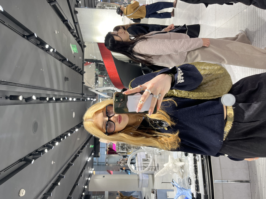 A young blonde woman with glasses takes a mirror selfie inside a store. She wears a dark top with embellished sleeves, a gold belt, and black skirt. She holds a phone with a patterned case. A green Bottega Veneta bag hangs over her shoulder. Reflected in the mirror are other shoppers and store displays, including lighting tracks on the ceiling.