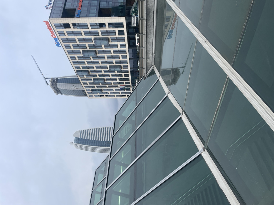 The scene depicts a modern urban environment in Sofia, Bulgaria, specifically the business district near the intersection of Tsarigradsko Shose and the Sofia Ring Road. The foreground is dominated by a geometrically segmented glass skylight structure, composed of multiple sloped and flat greenish-tinted glass panels set within light-colored metal frames. Reflections of the overcast sky and distant buildings, including a prominent 'RingCentral' logo, are visible on these surfaces. In the midground, an elevated multi-lane roadway runs horizontally, upon which a white van and other vehicles are in transit. Adjacent to the roadway on the right, a multi-story modern office building features a light-colored, patterned facade with recessed dark windows and displays prominent 'RingCentral' and partial 'Expert' signage. The background is defined by an overcast, light grey sky and two tall skyscrapers. On the left, Capital Fort is identifiable by its distinctive curved, white, and dark blue glass exterior. To its right, the taller Sky Fort skyscraper is under construction, with its upper levels incomplete and a large red and white tower crane positioned at its peak. No individuals are explicitly visible in the immediate outdoor scene performing actions or engaging in interactions. The overall lighting is diffused, consistent with an overcast sky.