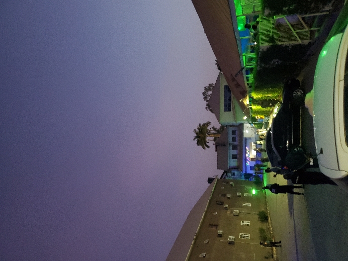 A nighttime scene features a building with visible air conditioning units lining its exterior. A taller, brighter building stands next to it, adorned with lush green plants and illuminated lights. A palm tree adds to the tropical ambiance. Cars are parked along the side, and figures are visible standing nearby, suggesting activity. The sky overhead transitions from a dark to a light gradient, indicating the time is near dusk or dawn.