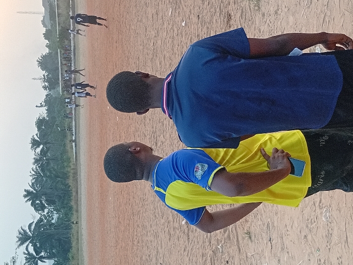 Two men stand on a dirt field watching a soccer game. One wears a dark blue shirt, while the other sports a yellow and blue jersey and holds a phone. A group of soccer players in uniforms are playing on the field, with trees visible in the background. The overall lighting suggests it might be early morning or late afternoon.