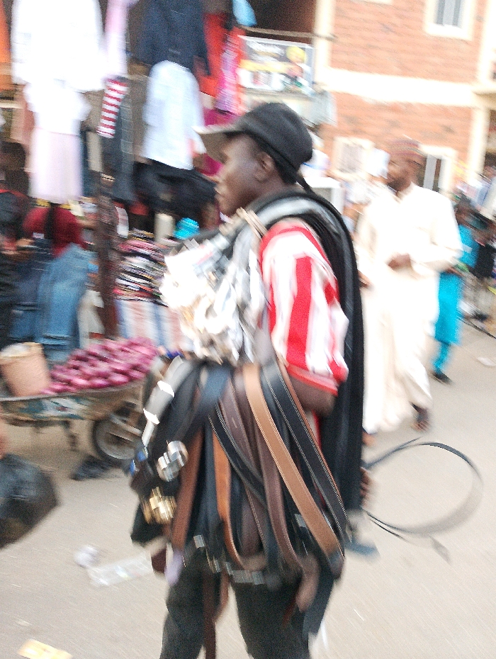 A man wearing a striped shirt and a cap is loaded with belts. He also has a black cape draped over his shoulders. He is walking down a street, and another man in a white robe is walking behind him. There is a wheelbarrow loaded with what appears to be onions in the background. There are also clothes and a building in the background.