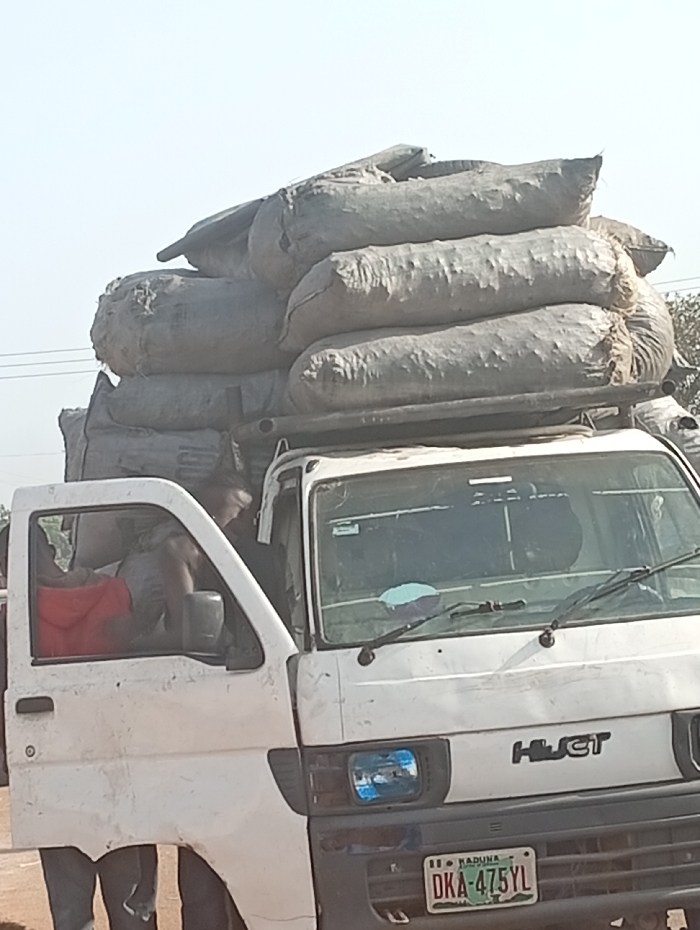 A white, utilitarian cab-over commercial van, marked "HJGT" on its grille and bearing a Nigerian Kaduna state license plate DKA-475YL, is stationary in Agunu, Nigeria, under a clear, bright blue sky. The vehicle is heavily overloaded with approximately ten large, dark-grey, cylindrical sacks, consistent with bulk goods transport, stacked several layers high on its roof rack. The driver's side door is fully open. Inside the cab, a person wearing a red shirt is visible. Below the open door, a second individual's legs, clad in dark trousers, are visible on the ground. A third individual's head and shoulders are partially visible behind the steering wheel inside the cab. The scene depicts a daytime transport operation.