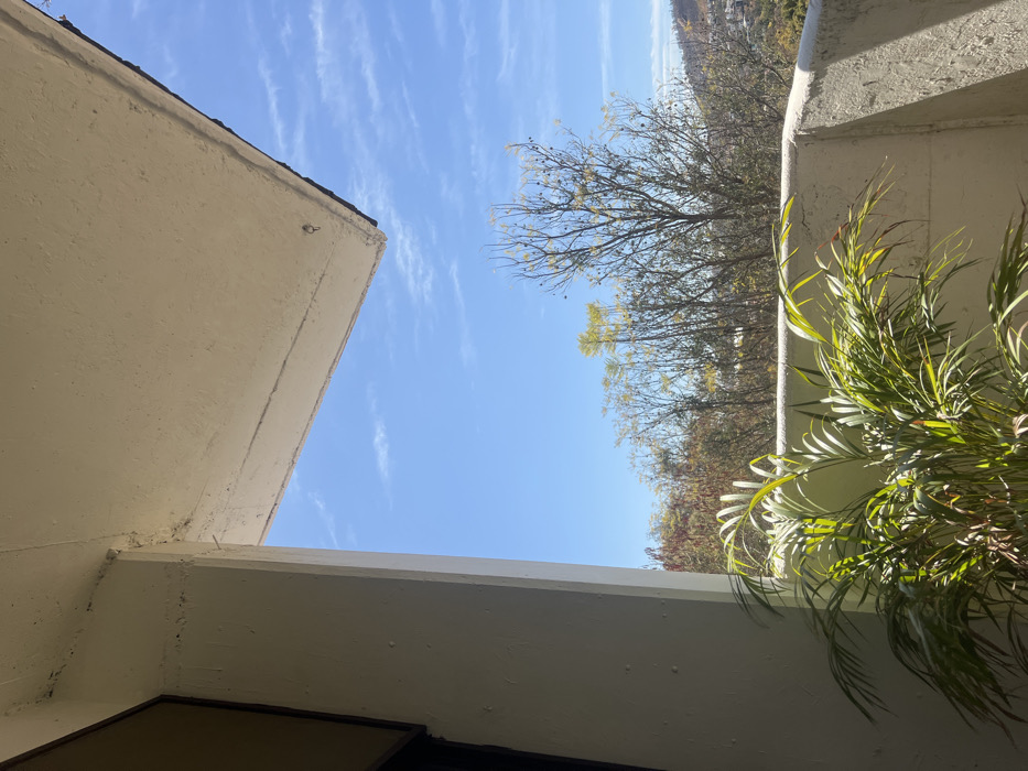 An upward shot of a building exterior reveals a bright blue sky streaked with wispy clouds. Bare branches of trees line the horizon, blurring into a cityscape in the distance. An adjacent white building's edge frames the left, while a concrete corner adorned with a full leafy plant adds a touch of green on the right. A horizontal ledge bisects the lower view, creating a framed perspective of the sky and landscape beyond.