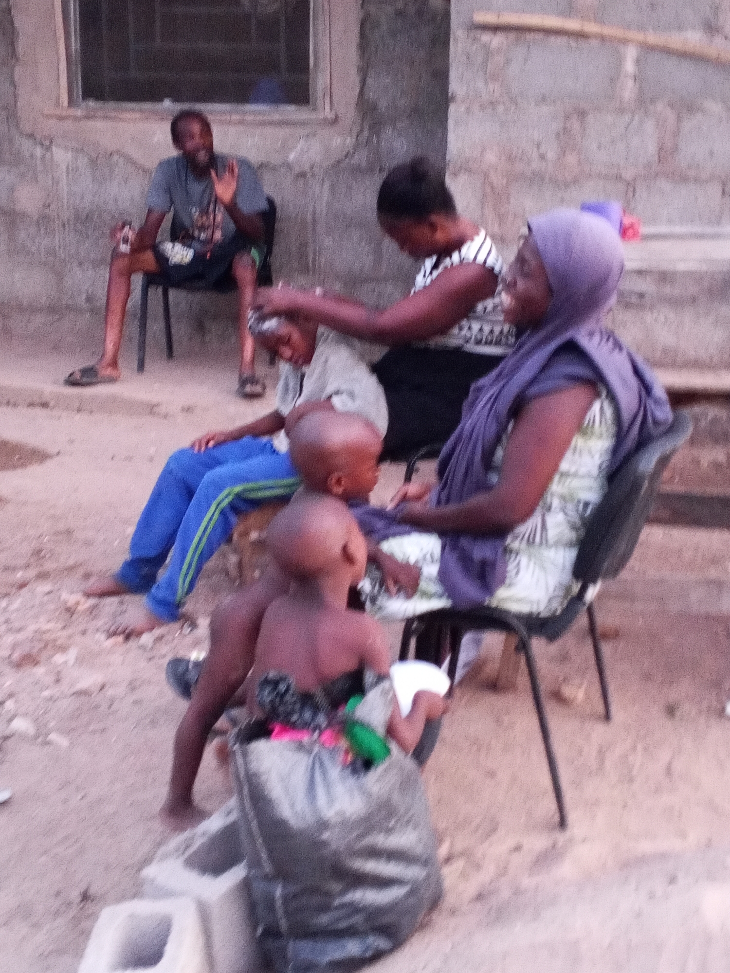In Adonkolo, Nigeria, a group of people are gathered outside a building. A man sits on a chair near a window, waving. A woman is grooming a child's hair, while another child sits beside them in blue track pants. An older woman in a hijab sits on a chair, looking on. A young child stands near her, holding a white object and leaning against what appears to be a bag. The environment is a dusty, outdoor space with cinder blocks on the ground. The building has a concrete exterior and a window.