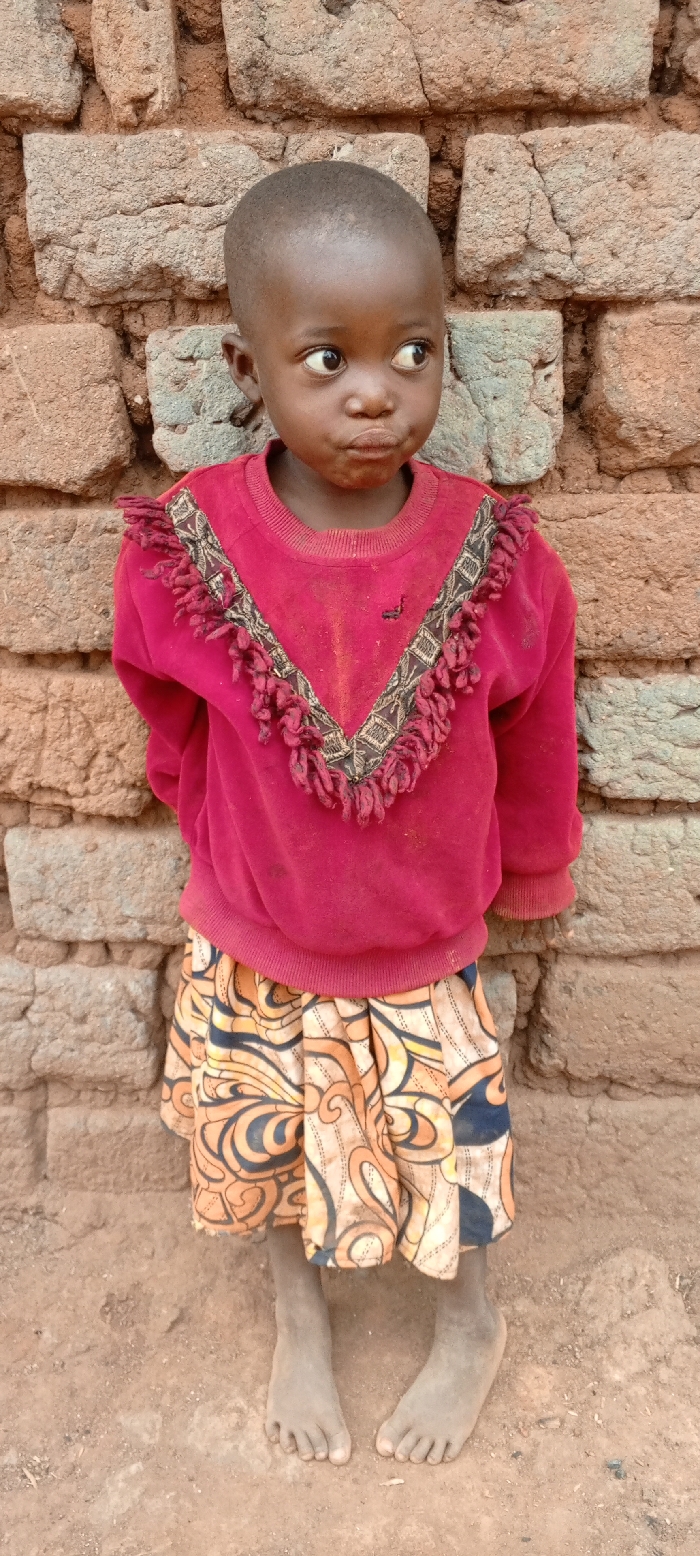 A young child stands outdoors near a brick wall. The child wears a red sweater with patterned trim and a colorful patterned skirt. The child's feet are bare and appear dusty. The child looks slightly off to the side with a pensive expression. The background is a simple brick wall, suggesting a rural or less developed setting. The lighting is natural and even.