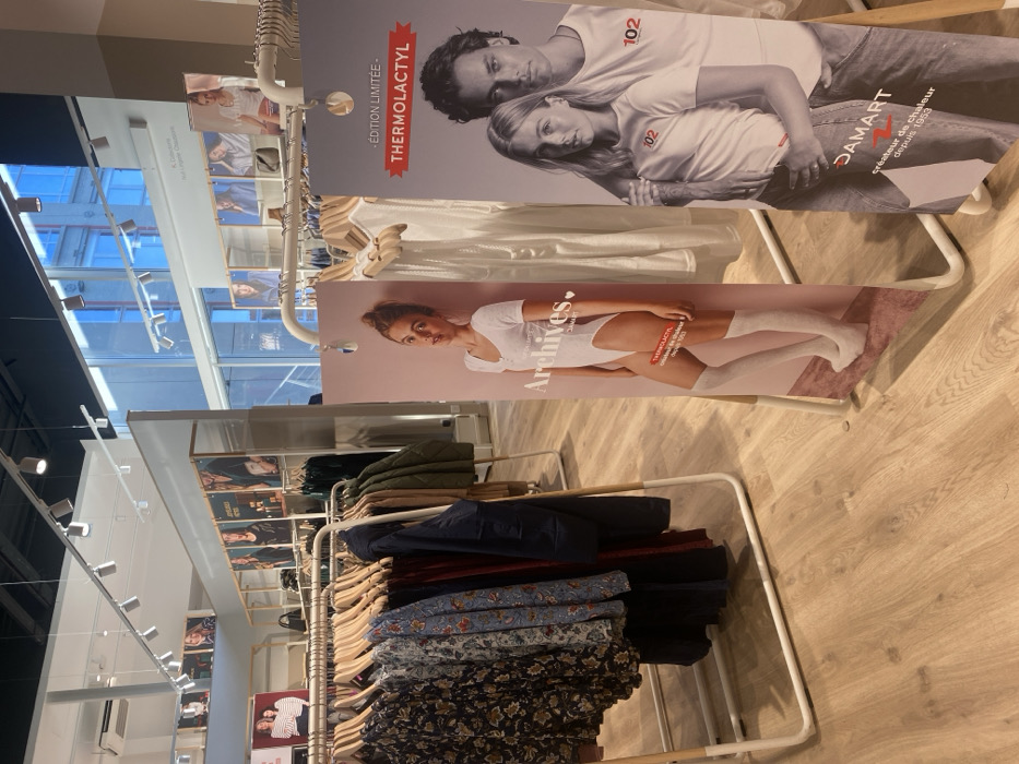 - "This image captures the interior of a Damart clothing retail store, likely located in Roubaix, France, identifiable by prominent Damart branding on advertising banners" by FM-xTDQG2, licensed under CC BY 4.0