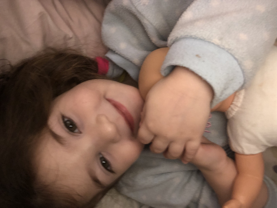 A young female child, with medium-length dark brown hair and brown eyes, is depicted smiling directly at the viewer while lying down. This scene is located indoors, presumably on a bed or soft surface, in Saverne, France. The child is wearing light blue, long-sleeved pajamas patterned with white stars or dots. A pink hair tie is visible on the right side of her head. Her hands are clasped together, holding a light-skinned doll, which is partially visible from the chest downward and dressed in a white garment. A small brown speck is present on the cuff of the child's left sleeve.