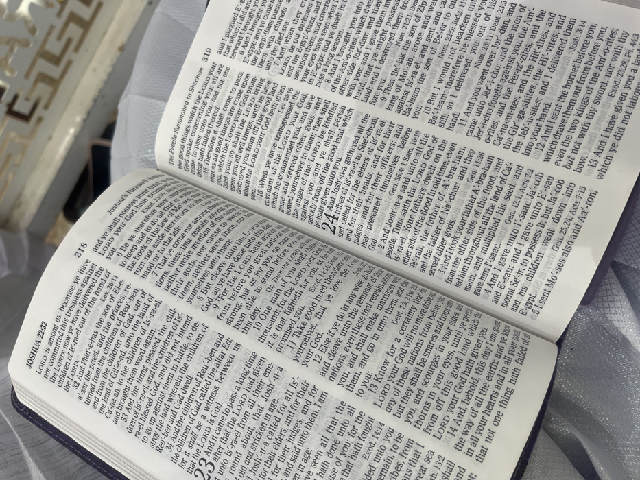 An open Bible, with a purple cover, rests on a light-colored, textured fabric surface in Langbasa, Nigeria