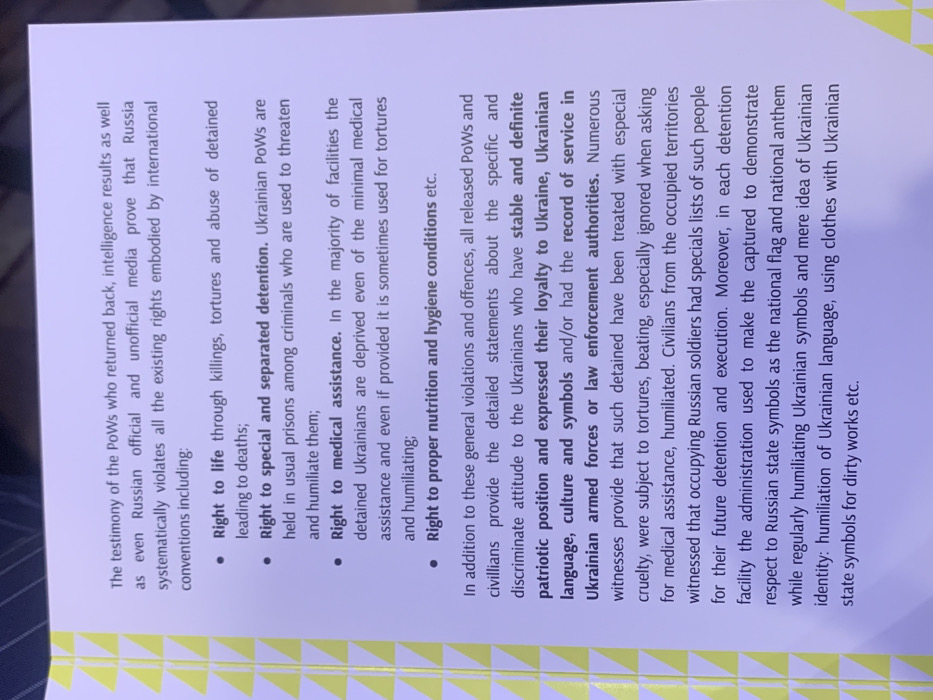 The image displays a printed page from a document or book, featuring black English text on a white background. A vertical border with a repeating yellow-green triangular pattern runs along the left edge of the page. The text details alleged violations of international conventions, citing testimony from returned Ukrainian Prisoners of War (PoWs) and intelligence results indicating that Russia systematically violates rights. Specific rights mentioned include the right to life (through killings, tortures, abuse), the right to special and separated detention (Ukrainian PoWs held with criminals for intimidation), the right to medical assistance (deprived or used for torture), and the right to proper nutrition and hygiene. Further text describes statements from released PoWs and civilians about discriminatory treatment, torture, humiliation (especially regarding Ukrainian patriotic symbols, language, and service in armed forces), and the use of Russian state symbols while degrading Ukrainian ones. No individuals or specific objects beyond the document page are visible. The image provides no visual information to determine a specific location in Warsaw, Poland, or any other city.